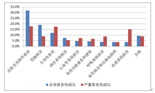 2019年國(guó)家基本藥物化學(xué)藥品和生物制品不良反應(yīng)/事件報(bào)告,按照藥品類(lèi)別統(tǒng)計(jì),報(bào)告數(shù)量排名前5位的分別是抗微生物藥、心血管系統(tǒng)用藥、抗腫瘤藥、激素及影響內(nèi)分泌藥、治療精神障礙藥;累及器官系統(tǒng)排名前5位的是皮膚及其附件損害、胃腸損害、全身性損害、神經(jīng)系統(tǒng)損害以及血液系統(tǒng)損害。